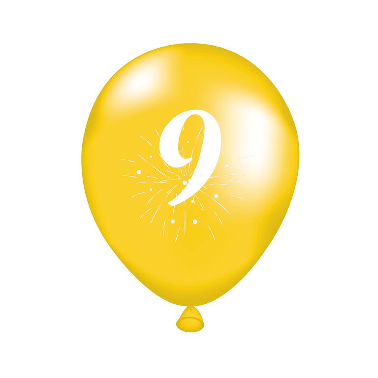 Party balónky s potiskem číslice "9" jsou vhodné na oslavu narozenin či různých výročí. Balení obsahuje 5 ks balónků (2x oranžový, 2x zelený, 1x žlutý o rozměru cca 25 cm (po nafouknutí). Balónky nafukujte pouze do přiměřeného rozměru. Manipulace dětí s balónky by měla probíhat pouze pod dozorem dospělé osoby. Skladujte při teplotách nad 10°C. Vyrobeno z přírodního latexu.