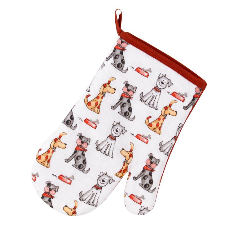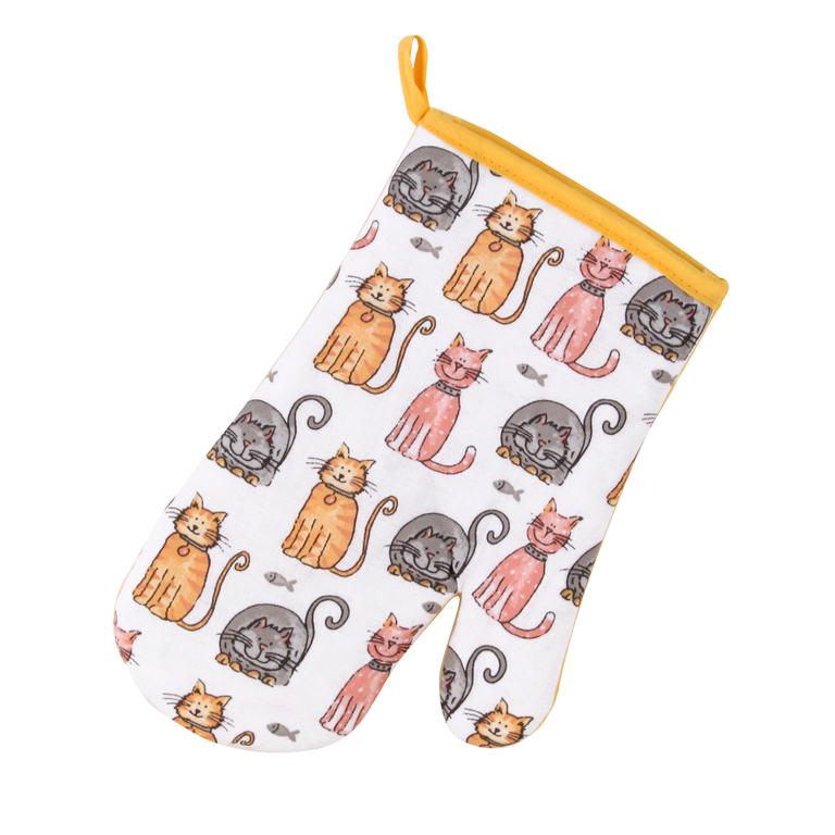 Kuchyňská chňapka "Kočka" a "Pes" - tvar rukavice. Je vhodná pro chycení a přenášení horkých nádob, pečících plechů z rozpálené trouby nebo na zvedání rozpálené pokličky. Materiál - povrch : přední strana - 100% bavlna, zadní strana:100% polyester, výplň: 65% bavlna, 35% polyester. Rozměry - 26,5 x 17 cm. Assort motivů - kočka nebo pes.