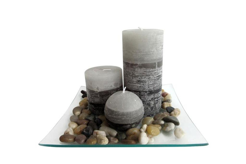 Dárkový set 3 svíčky s vůní jasmín na skleněném podnosu s kameny je vhodný nejen jako dárek, ale i jako dekorace. Materiál - parafín. Rozměry -
