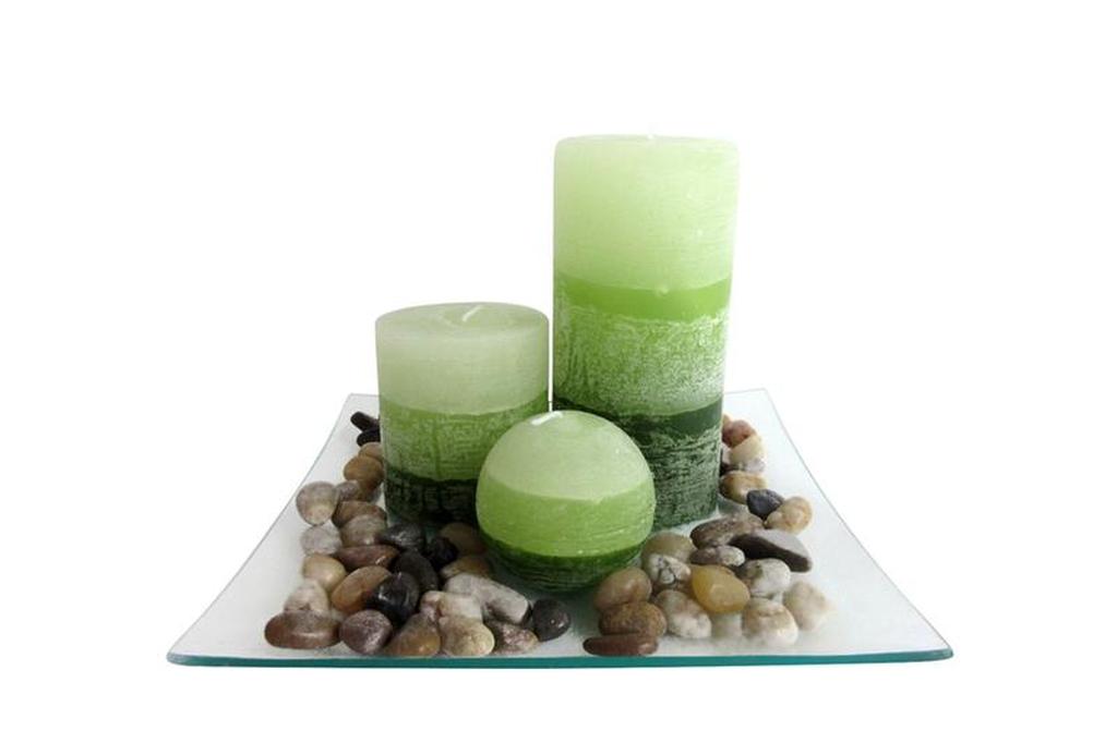 Dárkový set 3 svíčky s vůní zelený čaj na skleněném podnosu s kameny je vhodný nejen jako dárek, ale i jako dekorace. Materiál - parafín. Rozměry -