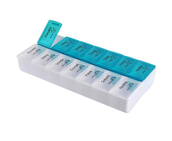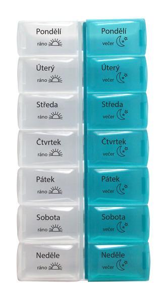 Plastová krabička na léky na celý týden. Sedmidenní dávkovač slouží ke spolehlivému a přehlednému uspořádání a dávkování léků i potravinových doplňků. Je značen symbolem zobrazujícím denní dobu (vycházející slunce) - Ráno / (měsíc) - Večer. Části dne jsou barevně odlišené pro lepší přehlednost. Každá část dne se otevírá samostatně. Materiál - plast.