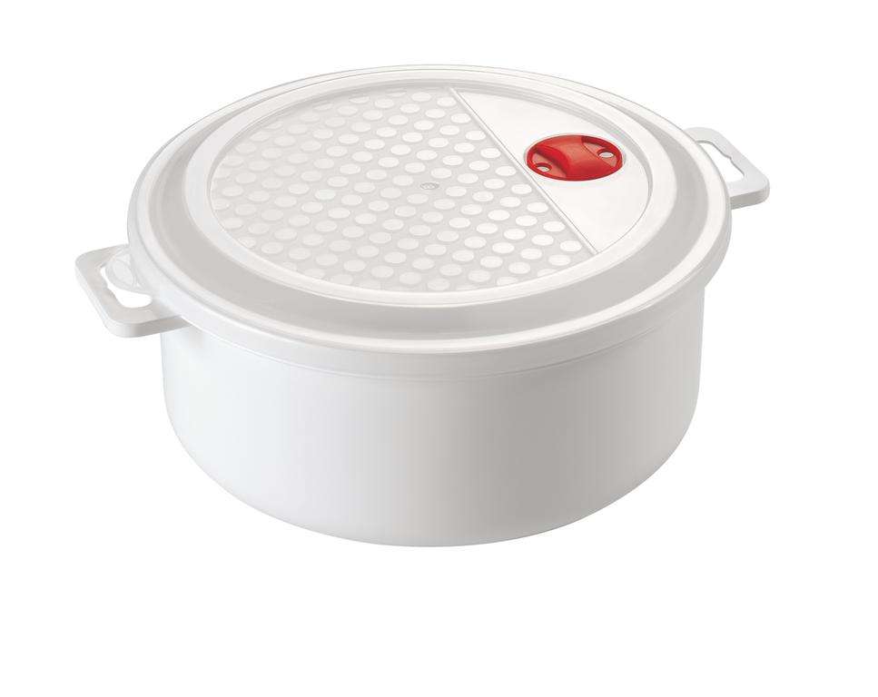 Plastová dóza je vynikající pro rychlé rozmrazování, ohřívání i vaření v mikrovlnné troubě. Hotové pokrmy pak můžete v dóze uchovávat v ledničce nebo zmrazit. Na víku má dóza otočný uzávěr pro odvod páry. Objem 3 l, rozměr 23 x 10 cm.