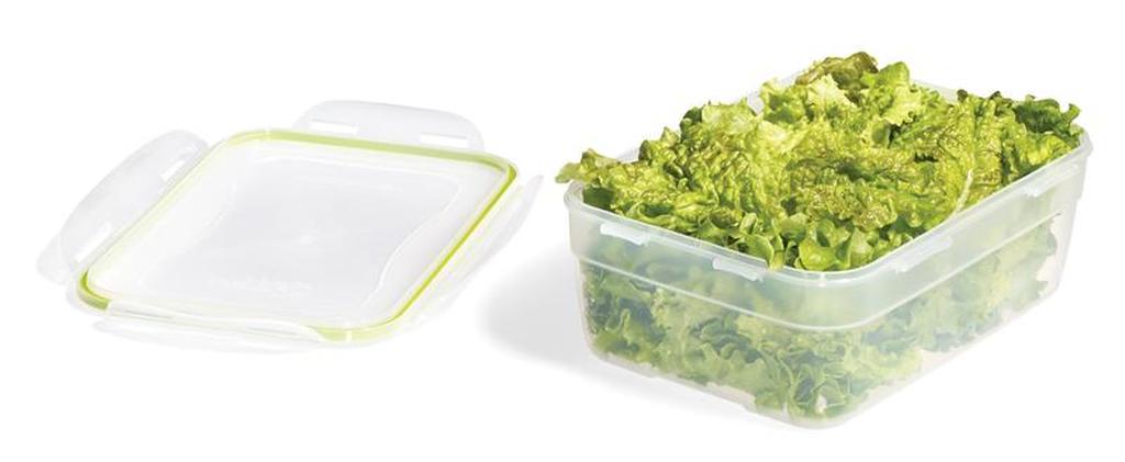 Dózy Lock & Lock "Easy Match" obdélníkové jsou bezpečné a funkční nádoby vyrobené z kvalitního plastu, který je trvanlivý a odolává vysokým teplotám. Tyto dózy jsou 100% vzduchotěsné a tím zajišťují dlouhodobou čerstvost uchovávaných potravin a jsou vynikající také z hlediska uchování vůně (aroma). Čtyři pohyblivé "klipy" zajišťující víko jsou odolné proti opotřebení. Nádoby mají speciálně upravené vnější dno tak, aby se mohly bezpečně stavět na sebe a neklouzaly. Dózy Lock & Lock lze použít v chladničce, v mikrovlnce, v mrazáku i v myčce na nádobí. Dózy Lock & Lock prošly přísnými hygienickými zkouškami a odpovídají nejpřísnějším předpisům. Objem 3 l. Barva čirá, zelená.