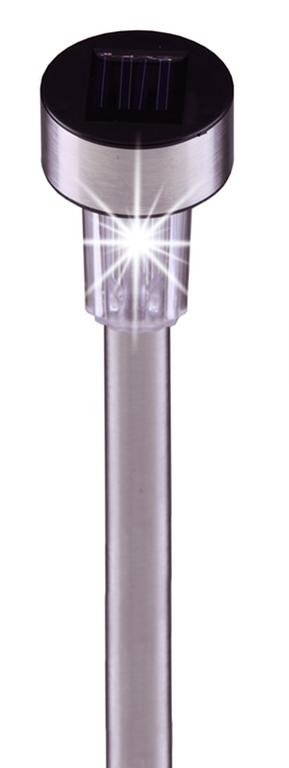 Zahradní solární led svítilna vyrobená z nerezové oceli v kombinaci s odolným plastem. Solární panel proměňuje sluneční světlo v elektrickou energii a shromažďuje ji během dne. Světelný senzor spouští světlo automaticky v noci. Světelným zdrojem je jasná LED žárovka s vysokou světelnou intenzitou po dobu až 8 hodin, při úplném nabití během dne. Součástí balení je 1 ks knoflíkové baterie 1.2V 40 mAh. Možné mechanické vypnutí. Rozměry - 4,8 x 4,8 x 36,5 cm.