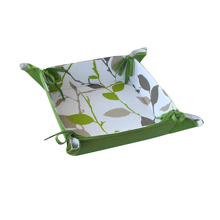 Bavlněný košík na chleba nebo jiné pečivo s motivem zelených květů. Skvěle doplní Váš jídelní stůl. Na každém rohu košíku je ozdobná mašlička. Rozměry - 20 x 20 x 5,6 cm.