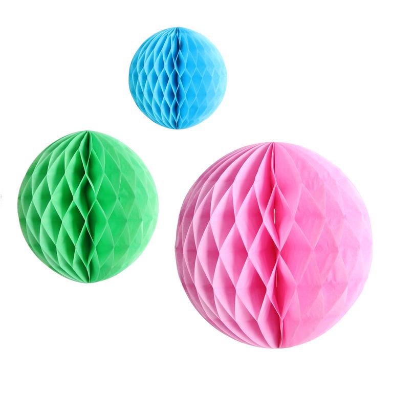Závěsná dekorační koule - balení 3 ks. Hodí se ke každé slavnostní příležitosti, skvěle vyzdobí interiér při oslavách a večírcích. Při roztažení vytváří efekt připomínající včelí plástve. Průměr koulí - 10, 15 a 20 cm. Materiál - papír. Assort barev.