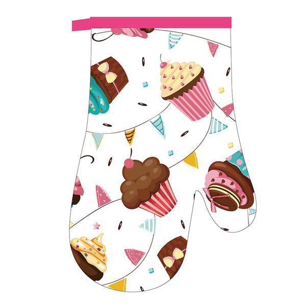 Kuchyňská chňapka - tvar rukavice je vhodná pro chycení a přenášení horkých nádob, pečících plechů z rozpálené trouby nebo na zvedání rozpálené pokličky. Motiv dortíky. Materiál - povrch: přední strana 100% bavlna, zadní strana 100% polyester, výplň: 65% bavlna, 35% polyester. Rozměry - 27 x 17 cm.