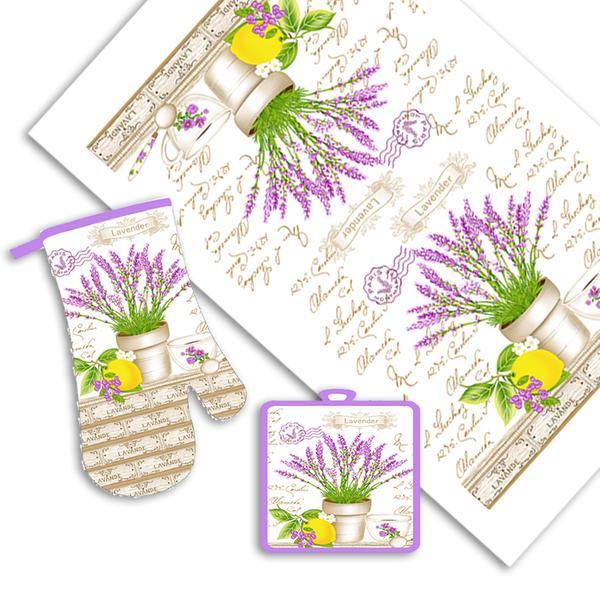 Kuchyňský set - utěrka, chňapka a rukavice s oblíbeným dekorem levandule zapadne do každé kuchyně. Tito tři pomocníci jsou v kuchyni nezbytní pro každodenní vaření, všechny mají praktická poutka na zavěšení. Materiál - bavlna. V sadě se nachází: utěrka - 38 x 63 cm, rukavice - 18 x 30 cm, chňapka - 18 x 20 cm.