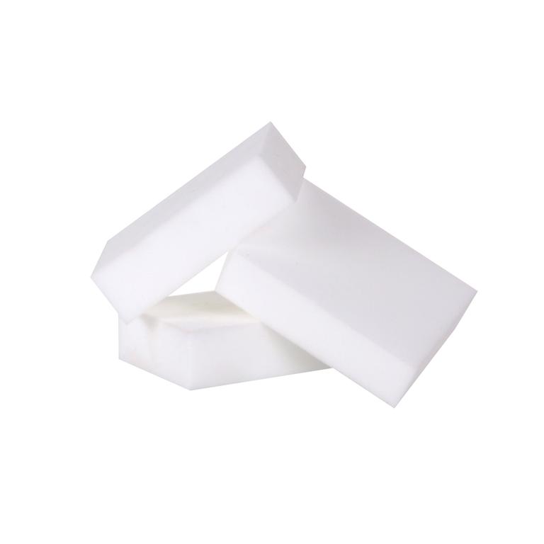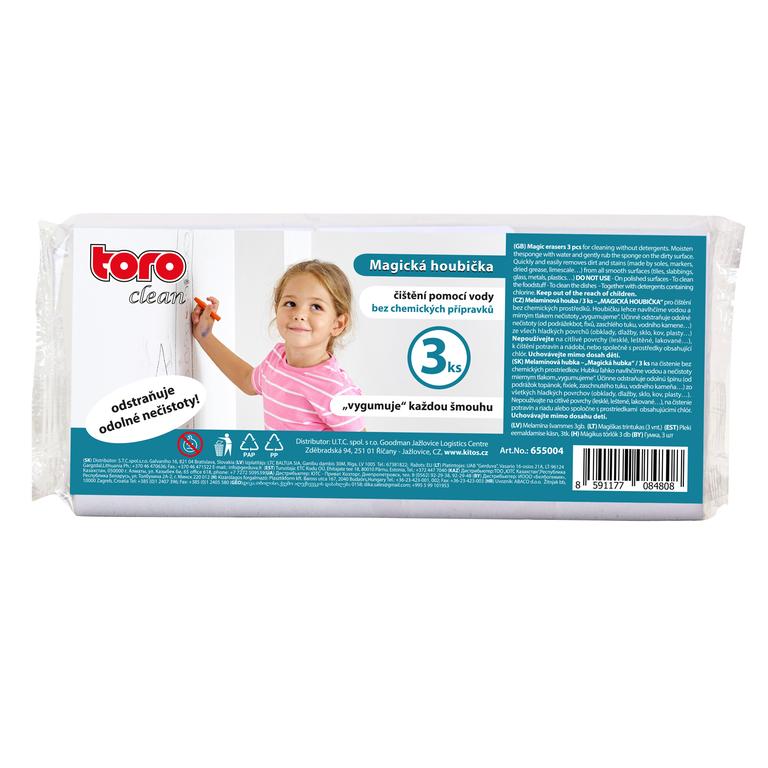 Melaminová houbička - "magická houbička", pro čištění bez chemických prostředků. Houbičku lehce navlhčíme vodou a mírným tlakem nečistoty vygumujeme. Účinně odstraňuje odolné nečistoty (od podrážek bot, fixů, zaschlého tuku, vodního kamene) ze všech hladkých povrchů (obklady, dlažby, sklo, kov, plasty). Nepoužívejte na citlivé povrchy (lesklé, leštěné, lakované), k čištění potravin a nádobí, nebo společně s prostředky obsahující chlór. Uchovávejte mimo dosah dětí. Barva bílá.