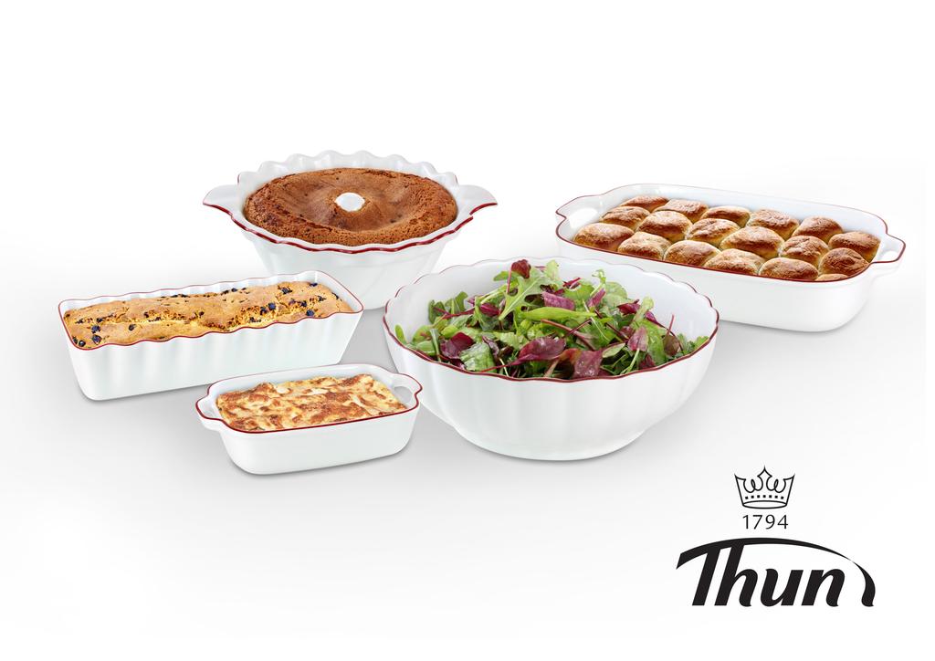 Společnost Thun 1794 a.s. nabízí svým zákazníkům speciální kolekce zapékacích mís, které jsou vhodné pro použití v mikrovlnných troubách. Samozřejmostí je použití v elektrických nebo plynových troubách. Nikdy je však nedávejte na přímý plamen. Mísy je možné mýt v myčkách. Velká výhoda zapékacích mís spočívá v tom, že při pečení dochází k pozvolnému převodu tepla na pokrm, a tím lepšímu prohřátí zapékaného pokrmu. Při servírování jídla si zapékací mísa udržuje naakumulovanou teplotu a pokrm vydrží během stolování příjemně teplý. Další velkou výhodou je velmi snadné odstraňování zbytků po pečení či zapékání. Aby Vám tyto výrobky dobře a dlouho sloužily, nikdy je nesmíte dávat horké do studené vody a nebo přímo z lednice do rozpálené trouby. Před prvním použitím umyjte v teplé vodě a osušte utěrkou.
