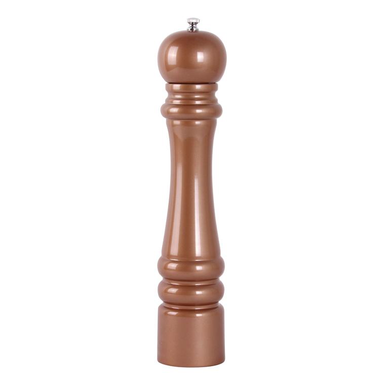 Mechanický mlýnek na sůl a pepř. Je vhodný k dochucování potravin. Je vyroben z kaučukového dřeva s polyuretanovým lesklým povrchem. Díky své výrazné barvě působí i jako dekorace na Vašem stole či kuchyňské lince. Mlecí mechanismus je z keramiky. Výška mlýnku - 35 cm. Barva měděná.