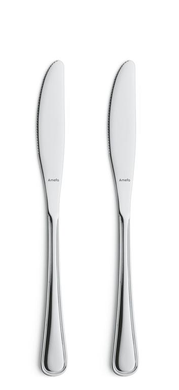 Jídelní nůž se vzorem na rukojeti je vyrobena z prvotřídní nerezavějící oceli 18/0. Kvalitní příbor pro každodenní použití. Zaoblené ručky příborů mají po celém obvodu jemné gravírování v podobě dvojité jemné čáry. Příbory jsou vhodné do myčky na nádobí. Rozměry výrobku:21,4 x 1,6 cm