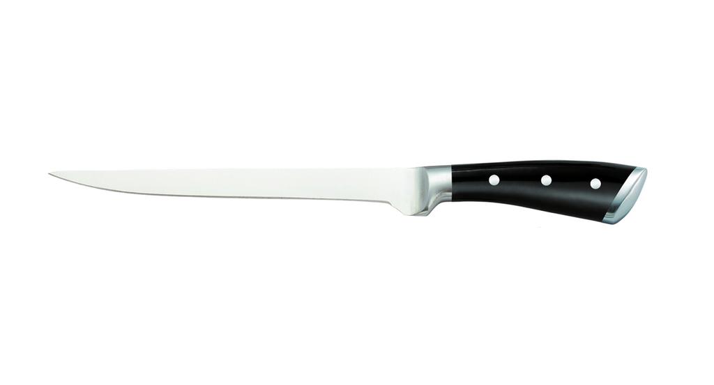 Nůž vykosťovací z nové řady Provence Gourmet Vás zaujme hned na první pohled. Je vyroben z vysoce kvalitní lesklé nerez oceli, protiskluzová pogumovaná rukojeť je dutá se 3 nerezovými nýty. Díky ní se nůž dobře drží a neklouže z ruky. Vykosťovací nůž je vhodný především k vykosťování masa. Lze jej mýt v myčce na nádobí. Délka čepele 17 cm. Barva stříbrná, černá rukojeť.
