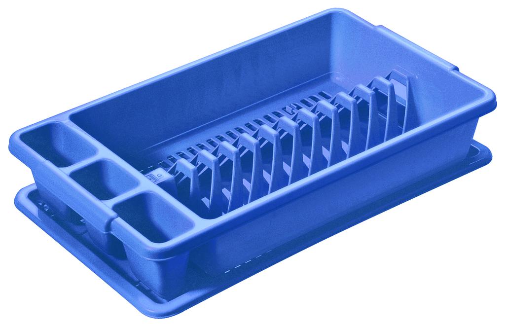 Plastový odkapávač s podnosem Tontarelli - má dvanáct jednotlivých přihrádek na zachycení talířů a zvláštní přihrádku pro příbory. Snadná údržba a čištění, je vhodný do myčky na nádobí. Rozměry velkého příborníku - 45 x 26 x 8,5 cm. Barva modrá.