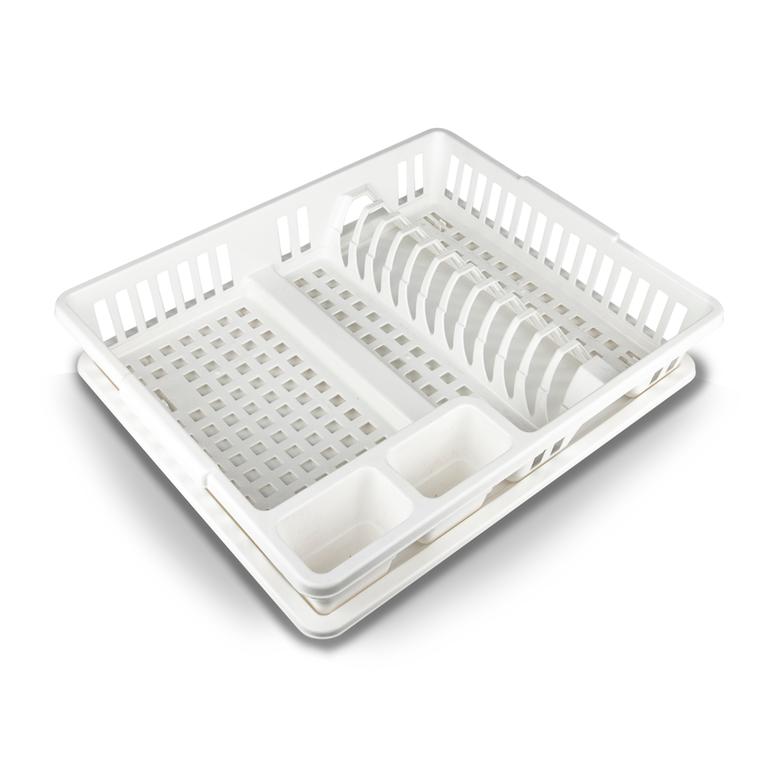 Plastový odkapávač s podnosem má dvanáct jednotlivých přihrádek na zachycení talířů a zvláštní přihrádku pro příbory. Snadno se udržuje a čistí, je vhodný do myčky. Rozměry 47 x 39 x 11 cm, v barevném provedení: bílá, modrá, zelená a taupe.