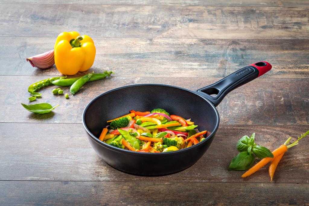 Silné dno a tělo pánve rovnoměrně rozvádí teplo, ergonomická rukojeť pánve krásně padne do ruky a díky povrchové úpravě Soft-touch je i velmi příjemná.
