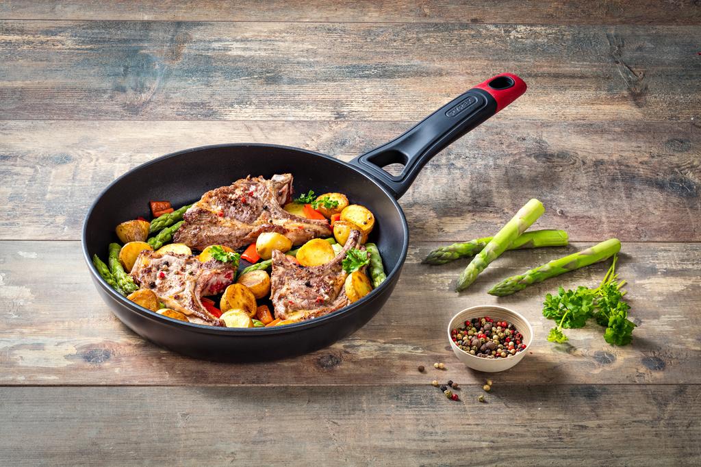 Silné dno a tělo pánve rovnoměrně rozvádí teplo, ergonomická rukojeť pánve krásně padne do ruky a díky povrchové úpravě Soft-touch je i velmi příjemná.