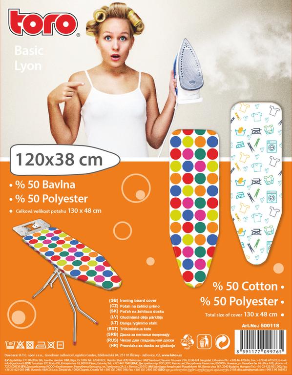 Potah na žehlící prkno 50% bavlna, 50% polyester, vhodné pro žehlící prkna o rozměru 120 x 38 cm.
