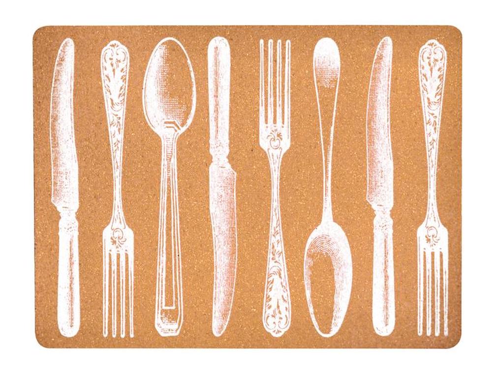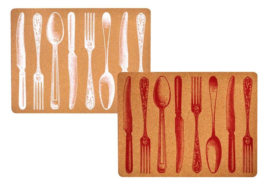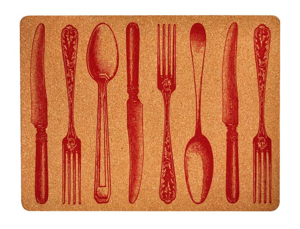 Elegantní prostírání s dekorem příborů je vhodné na každý jídelní stůl. Prostírání Příbory je vyrobeno z korku.Rozměry - 30x40 cm. Barva hnědá s bílým nebo červeným potiskem příborů.