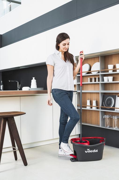 Vileda Easy Wring and Clean Turbo je set třásňového mopu a kbelíku se šlapacím pedálem. Díky tomuto setu snadno vyčistíte i tu nejodolnější špínu jedním tahem, a to i na obtížně přístupných místech jako jsou rohy místností či prostory pod nábytkem. Třásňový mop z mikrovlákna je vyrobený z recyklovaných materiálů, má teleskopickou tyč s nastavitelnou délkou 55-130 cm a kombinuje dva druhy třásní: bílé třásně mají výbornou absorpční schopnost a červené třásně jsou vyrobeny ze speciálního abrazivního materiálu, který zabrání sebemenšímu škrábnutí. Vaše podlaha tak bude krásně čistá a zároveň rychle suchá. Snadné ždímání díky pedálovému mechanismu, Easy Wring rotuje rychleji než 1000x za minutu. Mop se výborně hodí pro všechny typy tvrdých podlah (PVC, plovoucí podlahy, parkety a dlažby). Mycí návlek lze prát v pračce až na 60 °C, nepoužívejte aviváž ani sušičku. Možnost nákupu náhrady easy wring&clean nebo easy wring&clean TURBO