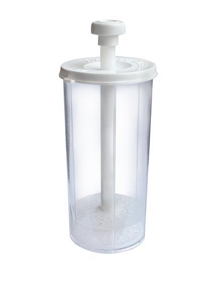 Plastový ruční rychlošlehač. Vyrobí za 1 až 2 minuty šlehačku, vaječný sníh, majonézy, vaječný krém, vaječné nápoje, sladkou smetanu i máslo. Nevhodné do myčky na nádobí, stačí omýt ve vlažné vodě. Výška nádoby 16,5 cm, průměr 7,5 cm.
