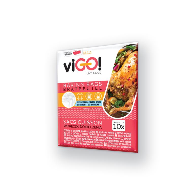 Sáčky na pečení ViGO! - sada 10 ks různých velikostí. Jsou vhodné do elektrické i horkovzdušné trouby. Zanechává pečenou potravinu šťavnatou a plnou chuti. Připravíte tak zdravé a nízkokalorické jídlo bez tuku. Díky nim neušpiníte troubu. V balení naleznete různé velikosti- 2 x extra velký sáček XL(krocan, šunka, velké kusy masa), 3 x velký sáček L(velké kuře, steaky), 3x střední sáček M(kuře, porce masa a zelenina) a 2 x dlouhé sáčky S(ryby).