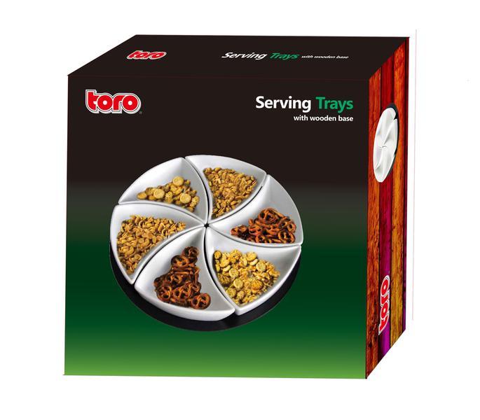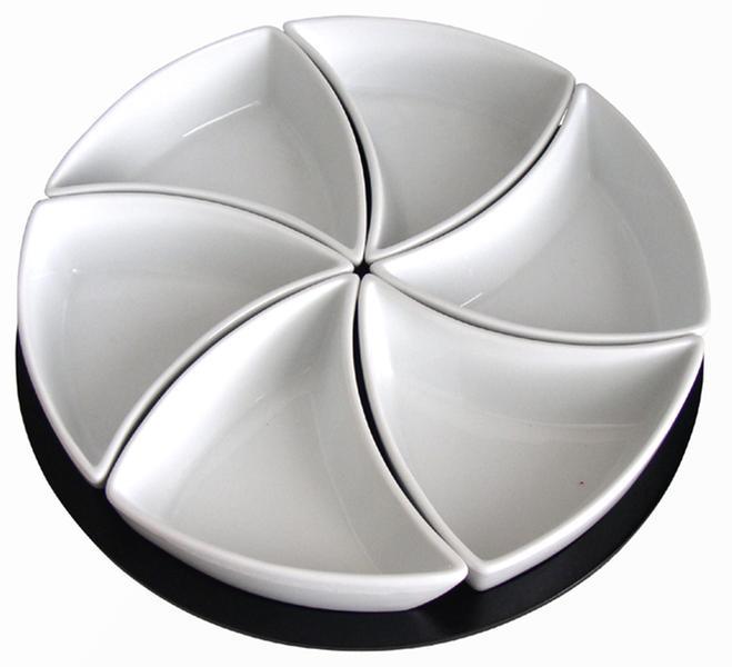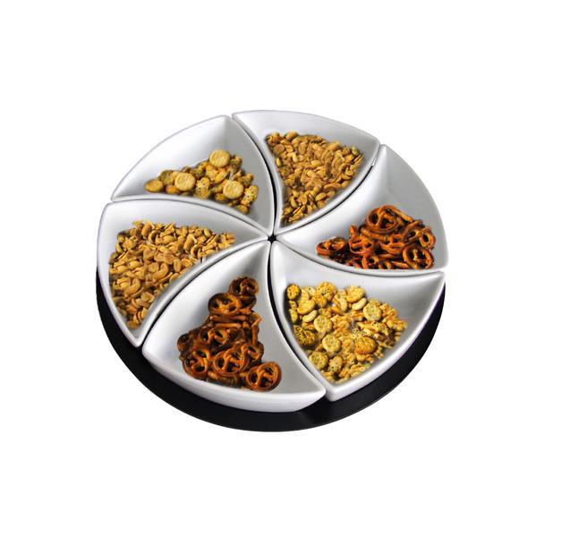 Velmi oblíbená sada šesti keramických misek "Větrník" na dřevěném podnose je velmi praktická při servírování různých pokrmů - například oříšků, oliv, sýrů apod. Misky mají velmi pěkný moderní design a svým tvarem jsou velmi zajímavé, jsou vhodné do myčky na nádobí, otáčivý podnos je snadno omyvatelný, stačí přetřít vlhkým hadříkem. Materiál - keramika, dřevo. Podnos průměr 30 cm, objem misek 200 ml. Rozměry - 14,3 x 4,8 x 10,5 cm.