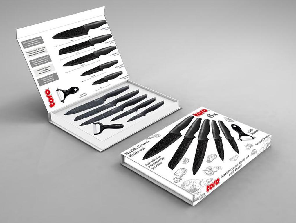 Kvalitní sada 5 nožů s mramorovým povrchem. Kuchyňské nože mají ergonomickou rukojeť, ostrou nerezovou čepel a hladký povrch. Jsou vysoce odolné a snadno se čistí. Sada obsahuje: kuchařský nůž 32,5 cm (délka čepele: 20 cm), porcovácí nůž 32,5 cm (délka čepele: 20 cm), nůž na chléb 32,5 cm (délka čepele: 20 cm), univerzální nůž 23 cm (délka čepele 12,5 cm), loupací nůž 19 cm (délka čepele: 8,75 cm) + keramická škrabka 13 cm.