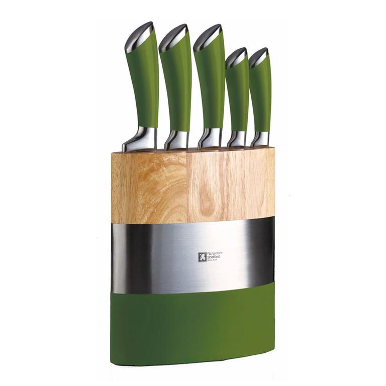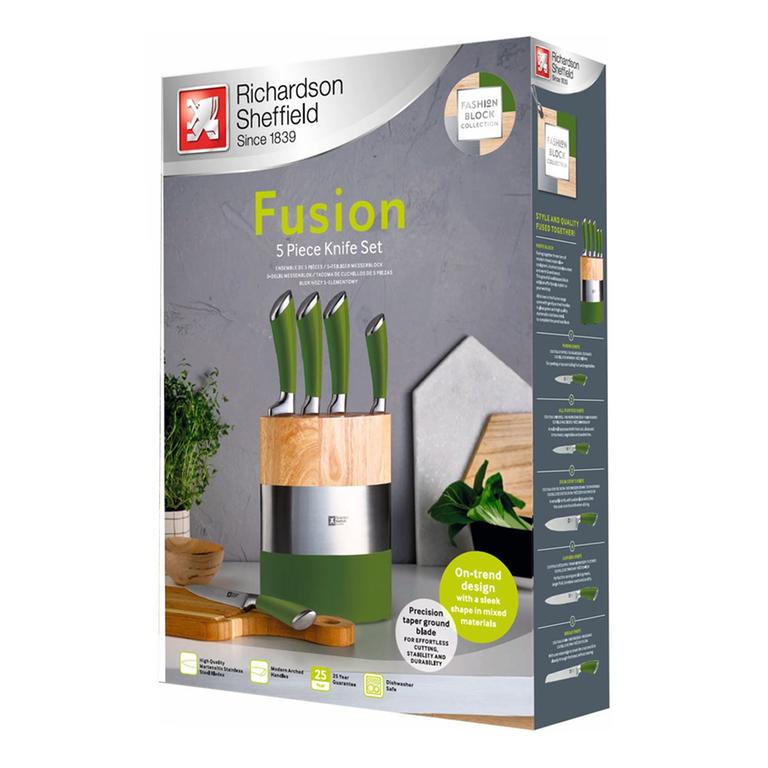 Sada 5 nožů v bloku RICHARDSON SHEFFIELD Fusion se zelenou rukojetí je speciálně navržena pro každodenní použití. Designové nože se stojanem od značky Amefa se hodí do každé moderní kuchyně. Nože jsou vyrobeny z vysoce kvalitní nerezové oceli, čepel každého nože je extrémně ostrá. Díky své lehké váze a perfektnímu ergonomickému tvaru nabízí tyto nože maximální komfort při krájení. Nože jsou vhodné do myčky. Blok do myčky nepatří. Neponořujte blok na nože ani do vody. Pokud je znečištěný, jednoduše jej pouze otřete vlhkým hadříkem.