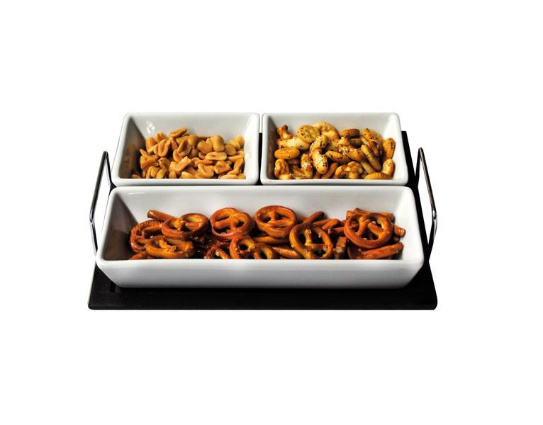 Velmi oblíbená sada tří keramických misek na dřevěném podnose je velmi praktická při servírování různých pokrmů, nerezová ouška po stranách podnosu zajišťují lehkou manipulaci. Misky jsou vhodné do myčky na nádobí, podnos je snadno omyvatelný, stačí přetřít vlhkým hadříkem. Materiál - keramika, dřevo, nerez. Rozměr podnosu - 19 x 22, 8 cm. Rozměr menších misek - 8, 4 x 10, 3 x 3, 3 cm, objem 100 ml.