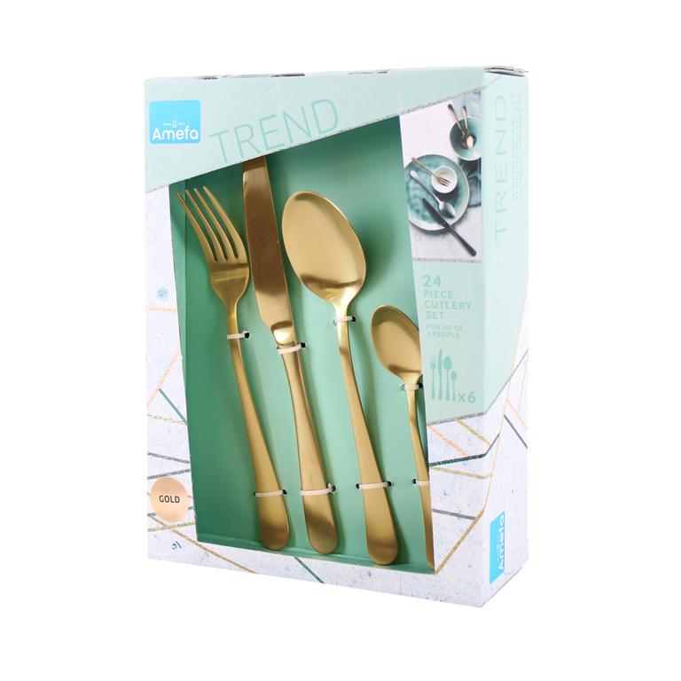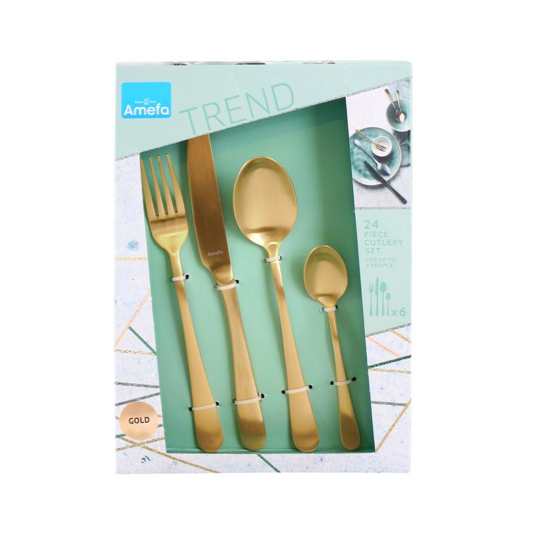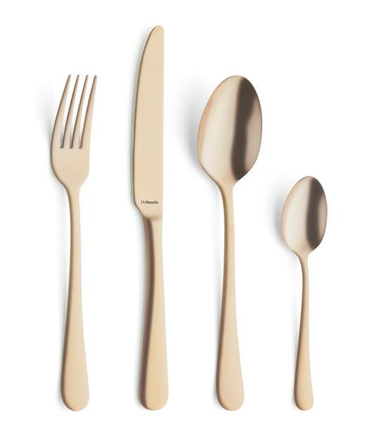 Sada 24 ks příborů AUSTIN je vyrobena z prvotřídní nerezavějící oceli 18/0, kazetové balení obsahuje 6 jídelních nožů, 6 vidliček, 6 polévkových lžic a 6 kávových lžiček. Kvalitní příbor pro každodenní použití v neotřelém moderním designu, ve stylu Vintage, v matném provedení a originální barvě. Nelze mýt v myčce na nádobí.