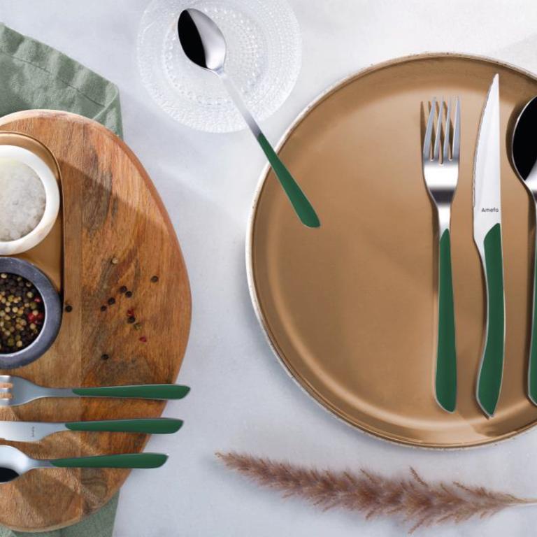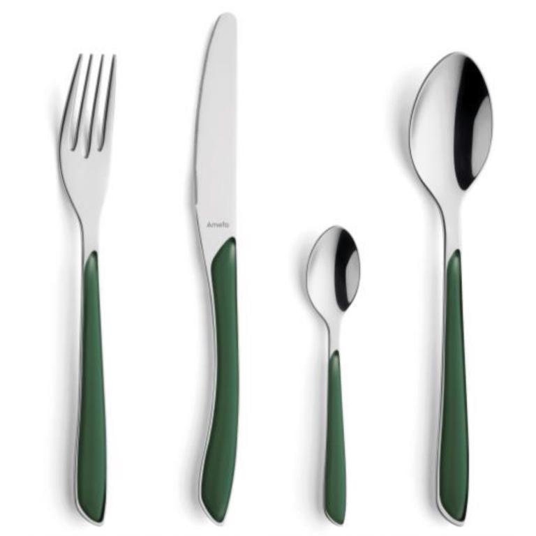 Sada příborů AMEFA 24 ks Eclat zelená – moderní souprava obsahuje 24 kusů z nerezové oceli 18/0: 6 příborových nožů, 6 vidliček, 6 polévkových lžic a 6 středních kávových lžiček s barevnou rukojetí. Všechny lze navíc prakticky mýt v myčce. Příbory jsou vyrobené z chromoniklové oceli, která jim zajišťuje vysokou odolnost proti korozi a lesklý zrcadlový povrch. Příbory Amefa udělají z každého stolování zvláštní příležitost a budou se skvěle doplňovat s ostatním prostíráním.
