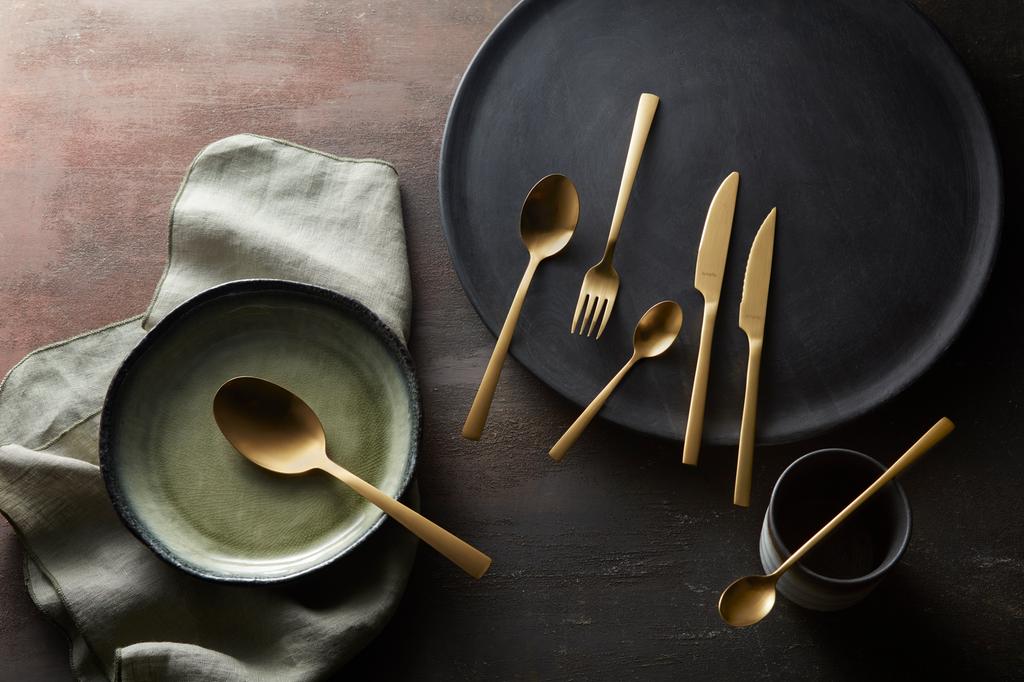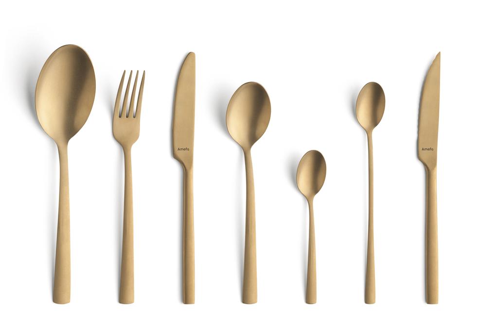 Sada příborů AMEFA 42ks Manille ALL YOU NEED zlatá budou ozdobou jídelního stolu. Zhotovené jsou z kvalitní nerezové oceli. V sadě najdete klasickou lžíci, vidličku, nůž i lžičku spolu se steakovým nožem, lžící na zeleninu a lžičku na latté, to vše po šesti kusech - 6× lžíce, vidlička, nůž, lžička, steakový nůž, lžíce na zeleninu, lžička na latté. Nepoškrábou se, udrží svůj vzhled. Nelze mýt v myčce.
