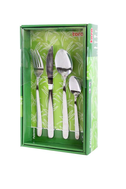 Kvalitní sada příborů Palermo pro každodenní použití. Kazetové balení obsahuje klasický příborový set po šesti kusech - 6x jídelní nůž, 6x vidlička, 6x polévková lžíce a 6x kávová lžička. Příbory jsou vyrobeny z prvotřídní nerezavějící oceli, jsou vhodné do myčky na nádobí.