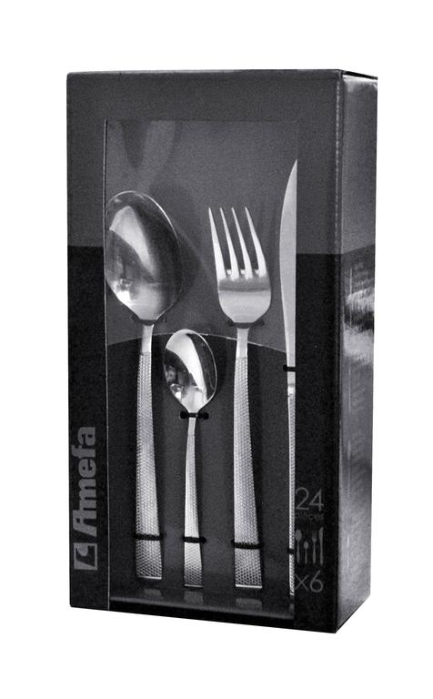 Sada příborů Parure je vyrobena z kvalitní nerezové oceli a je novinkou firmy Amefa. Kazetové balení obsahuje 24 ks - 6 jídelních nožů, 6 vidliček, 6 polévkových lžic a 6 kávových lžiček. Vhodné do myčky na nádobí.