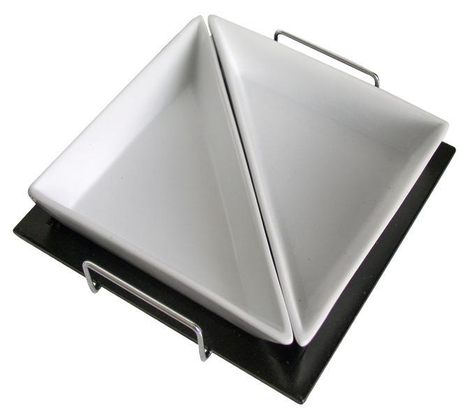 Velmi oblíbená sada dvou keramických trojúhelníkových misek na dřevěném podnose je velmi praktická při servírování různých pokrmů. Nerezová ouška zajišťují lehkou manipulaci. Misky jsou vhodné do myčky na nádobí, podnos je snadno omyvatelný, stačí přetřít vlhkým hadříkem. Objem každé misky je 200 ml. Rozměry podnosu -19, 4 x 19, 1 cm.