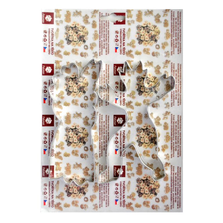 Sada 2 ks vykrajovátek na cukroví. Ve tvaru čerta a mikuláše - malá. Vykrajovátka jsou z pocínovaného potravinářského plechu. Délka cca 14 cm.