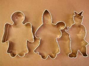 Sada 3 ks vykrajovátek na cukroví. Ve tvaru čerta,mikuláše a anděla. Vykrajovátka jsou z pocínovaného potravinářského plechu. Rozměry - anděl: 7,7 x 4,8 cm, čert: 7,7 x 3,8 cm, Mikuláš: 8,1 x 4,7 cm.
