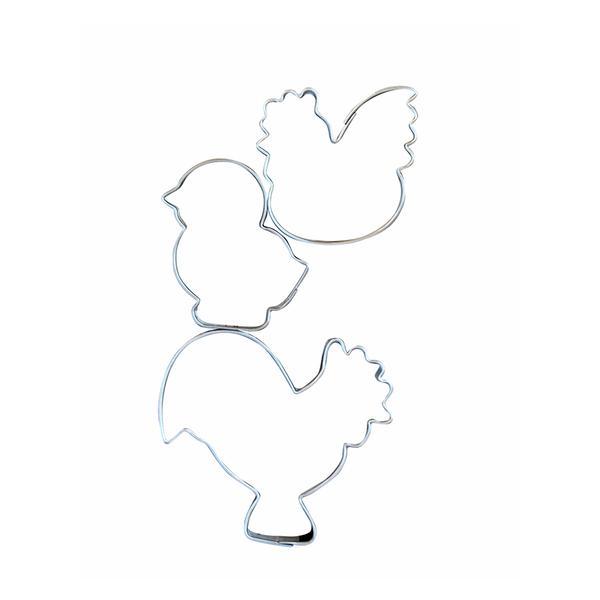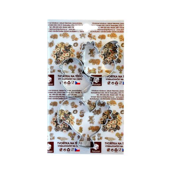 Velikonoční sada vykrajovátek. Vykrajovátka jsou vyrobená z pocínovaného plechu. Vhodné na cukroví, perníčky, potahové nebo modelovací hmoty. Vykrajovátka jsou od českého výrobce a splňují všechny předepsané normy. Sada obsahuje 3 ks: kohoutek, slepička, kuřátko.