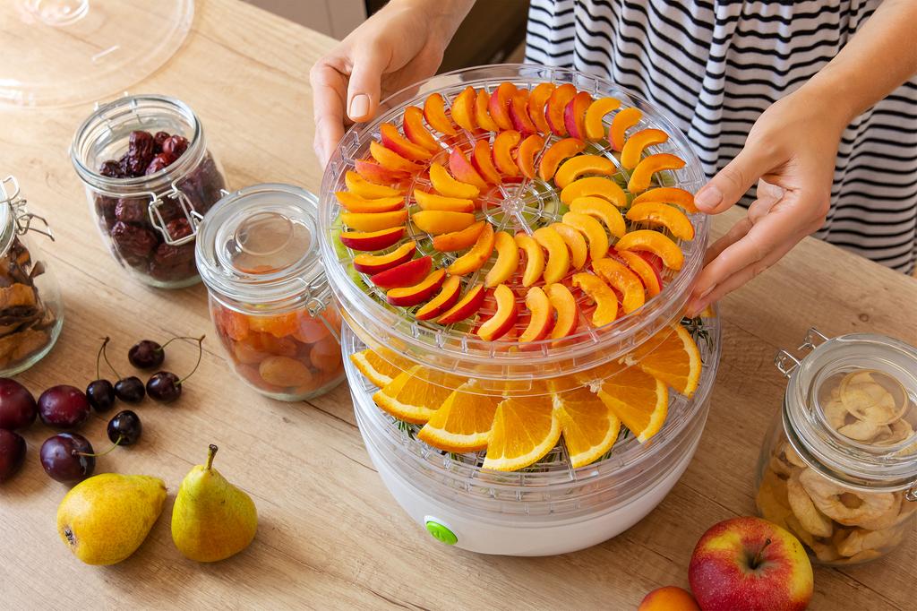 Vlastnosti: kompaktní sušička potravin nabízí 5 sušících podnosů s nastavitelnou výškou, průměr sušícího podnosu: 23 cm,žitná výška patra: 1,3 cm, integrovaný ventilátor napomáhá rovnoměrnému sušení na všech patrech, průhledné víko a podnosy umožňují okamžitou vizuální kontrolu nad stavem sušení, design mřížky sušících sít zabraňuje vzniku plísní a optimalizuje proudění vzduchu, sušící síta i víko je možno mýt v myčce nádobí, tepelná pojistka proti přehřátí