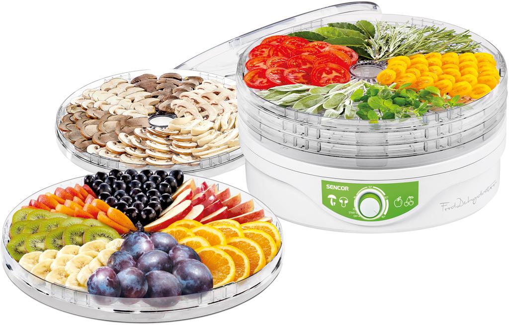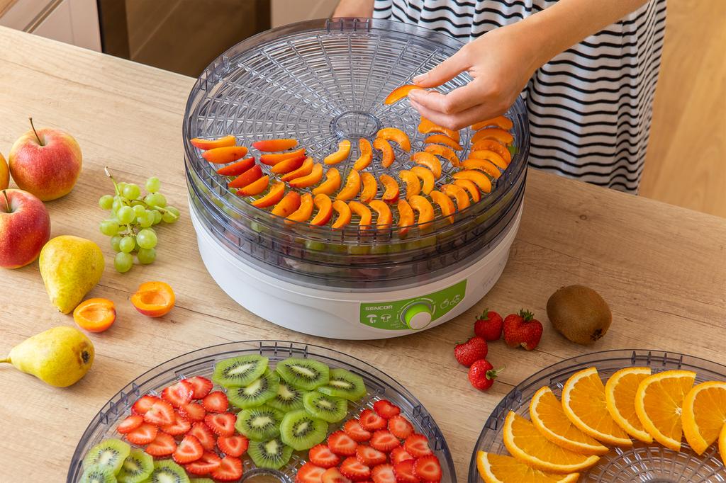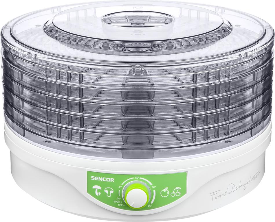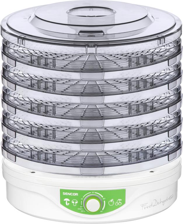 Sušička potravin Sencor má ve výbavě 5 sušících sít a je vhodná například k sušení ovoce, bylinek, hub, masa nebo ryb. Integrovaný ventilátor napomáhá rovnoměrnému sušení na všech patrech a design mřížky sušících sít zabraňuje vzniku plísní a optimalizuje proudění vzduchu.