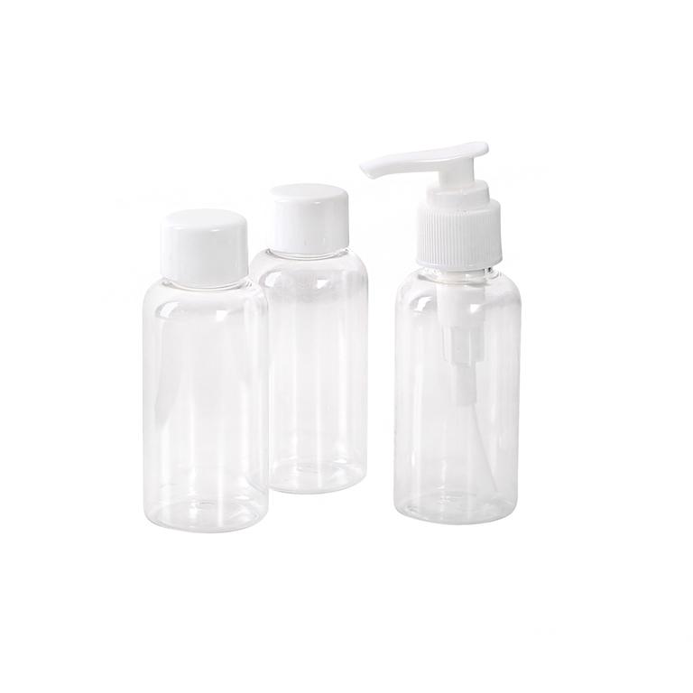 Set 3 ks cestovních lahviček na kosmetiku. Můžete si do nich přelít parfémy, tinktury, tužidlo na vlasy a podobné kosmetické přípravky. Jejich předností jsou kompaktní rozměry, takže se hodí na cesty. Balení obsahuje 3 nádobky - 1 z nich s pumpičkou. Materiál - plast. Rozměry - 3,8 x 9,8 cm. Barva čirá - bílé víčko.