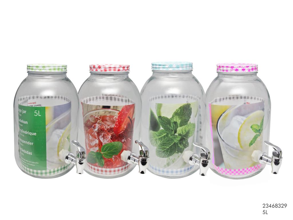 Sklenice na nápoje se šroubovacím uzávěrem a otočným plastovým kohoutkem je praktickým doplňkem a ozdobou každé party, oslavy či grilování. Jsou vhodné na studené nápoje, například na domácí limonádu, míchané drinky apod. Objem 5 l, materiál - sklo, plast, kov.