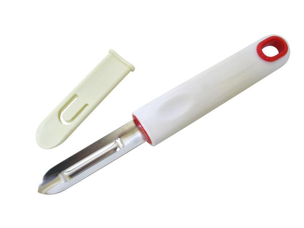Škrabka na brambory je nezastupitelným pomocníkem při čištění zeleniny. Škrabka má ochranu ostří. Rukojeť je uzpůsobena pro zavěšení na závěsnou tyč. Kuchyňské náčiní TORO v bílo-červeném dekoru vytváří ucelenou řadu výrobků, která svou kvalitou splňuje všechny Vaše požadavky. Materiál - nerez, plast. Rozměry - 19, 5 x 2, 5 cm.