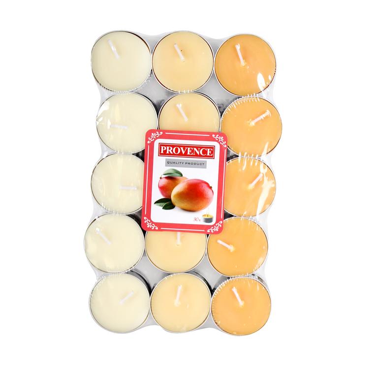 Jednoduchý zdroj světla, který navodí ve Vašem domově příjemnou atmosféru. Čajová svíčka je zároveň vhodná na vytváření vánočních, velikonočních, ale i jiných arengema. Nezapomeňte prosím dbát na bezpečnost a držte se na svíčce uvedených bezpečnostních piktogramů. Vůně mango. Sada 30 ks.Doba hoření: cca 4 hodiny.