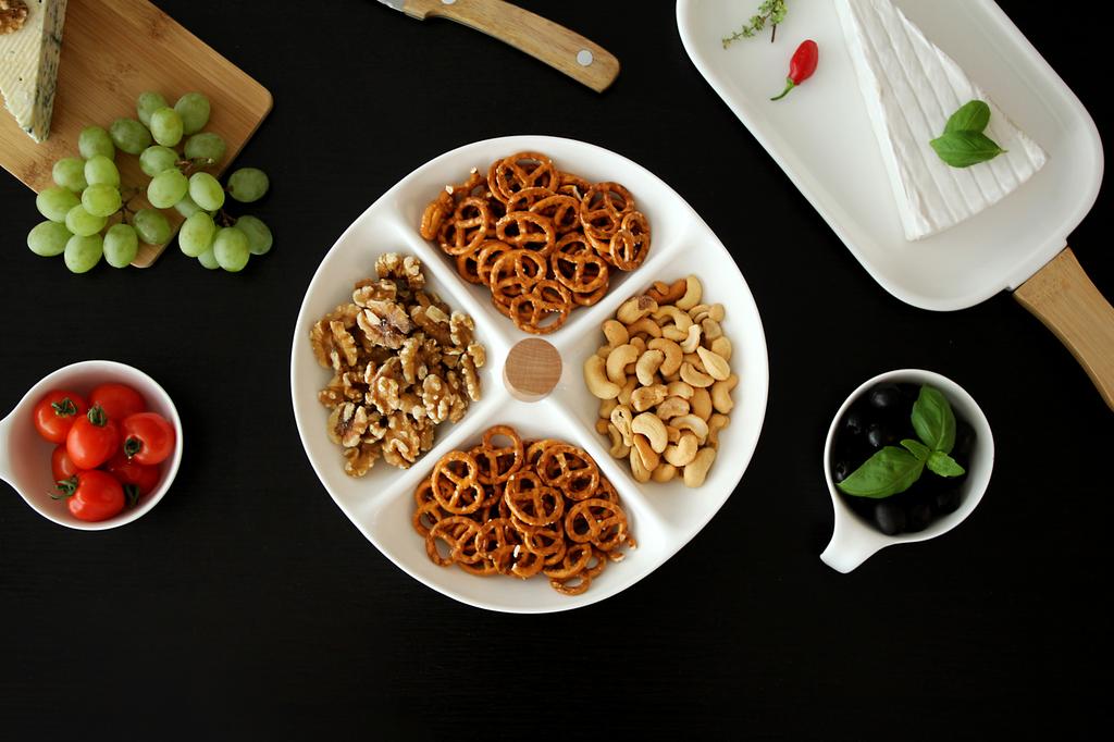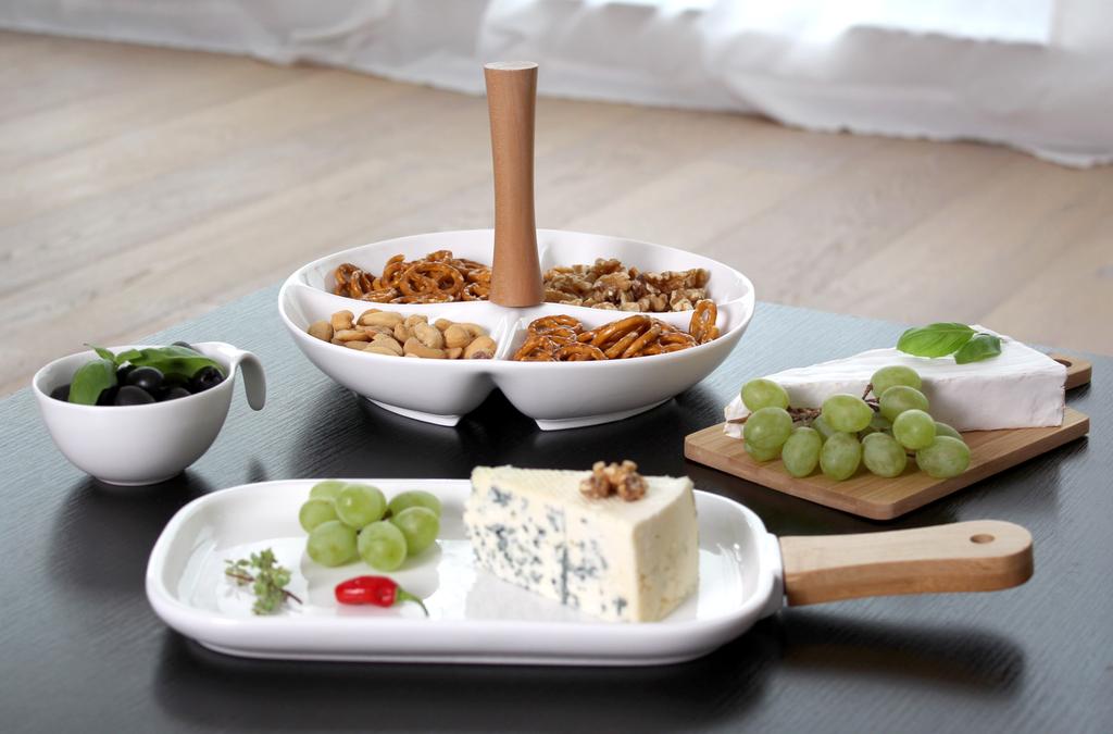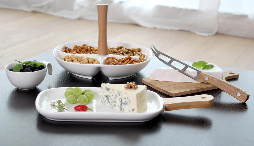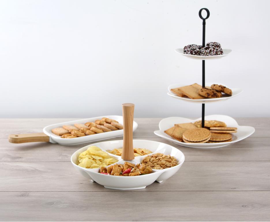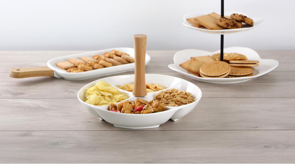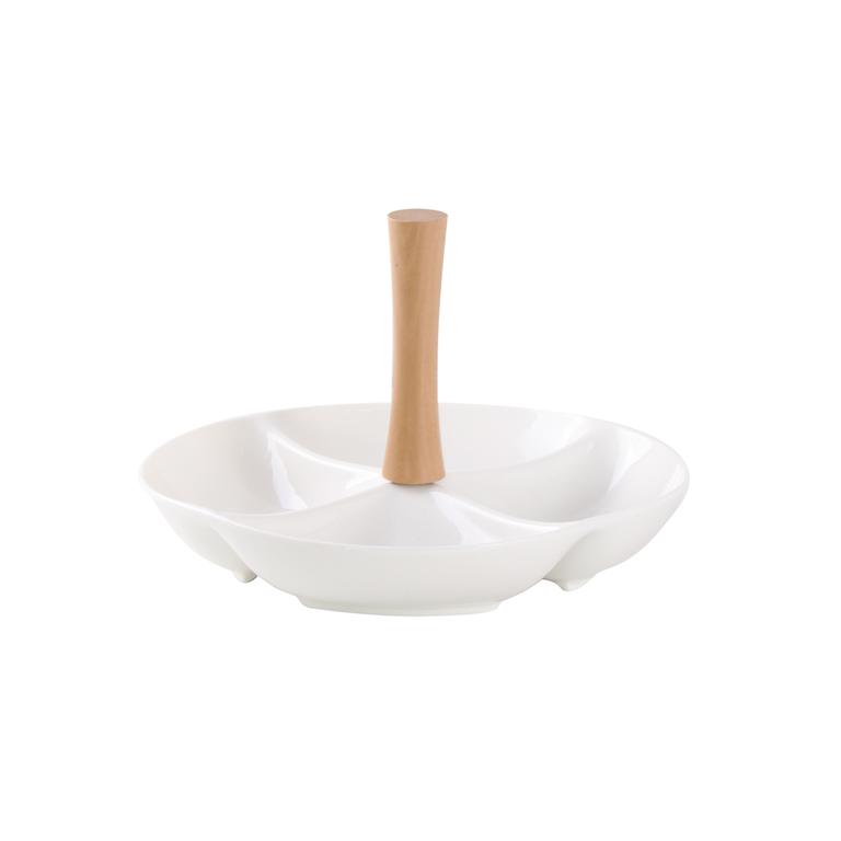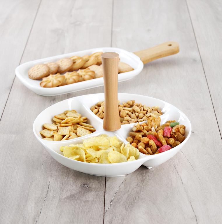 Elegantní sada čtyř keramických misek je spojena dřevěným madlem. Do misek můžete dát mandle, oříšky, olivy i další pochutiny pro večerní mlsání, ale je i vhodná na slavnostně prostřený stůl. Keramické misky snadno umyjete. Rozměr 24,8 x 4,5 cm.