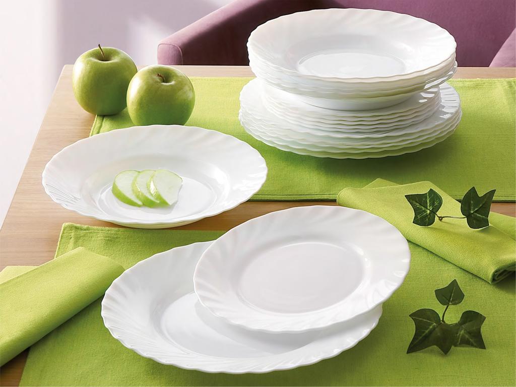 Jídelní talíř "TITAN" průmě 24 cm z opálového skla. Materiál je odolnější než porcelán, neodšťipuje se, je čistě bílý a navíc velmi lehký. Je vhodný do myčky nádobí i mikrovlnné trouby.