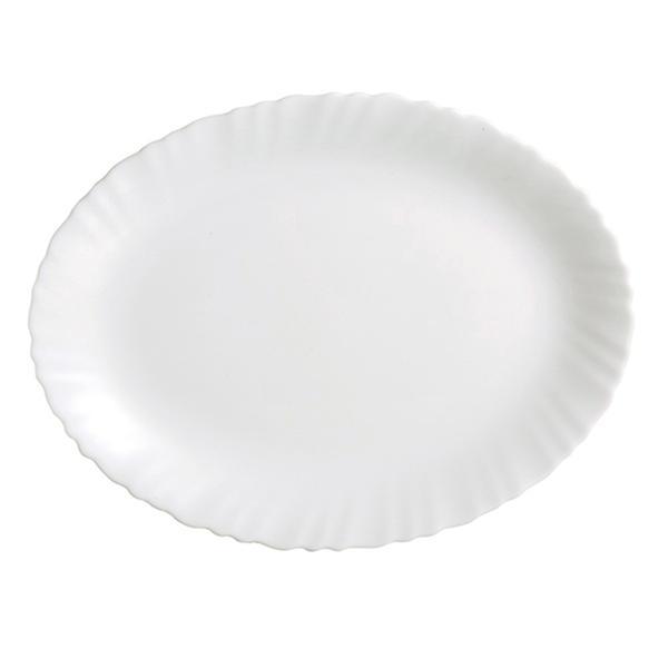 Jídelní oválný talíř "Titan" je krásný moderní talíř vyroben z opálového skla. Opálové sklo je tvrzené sklo, nahrazuje porcelán a je těžko rozbitné, velice oblíbené. Šířka talíře je 36 cm. Jemně vlnitý okraj. Barva bílá.
