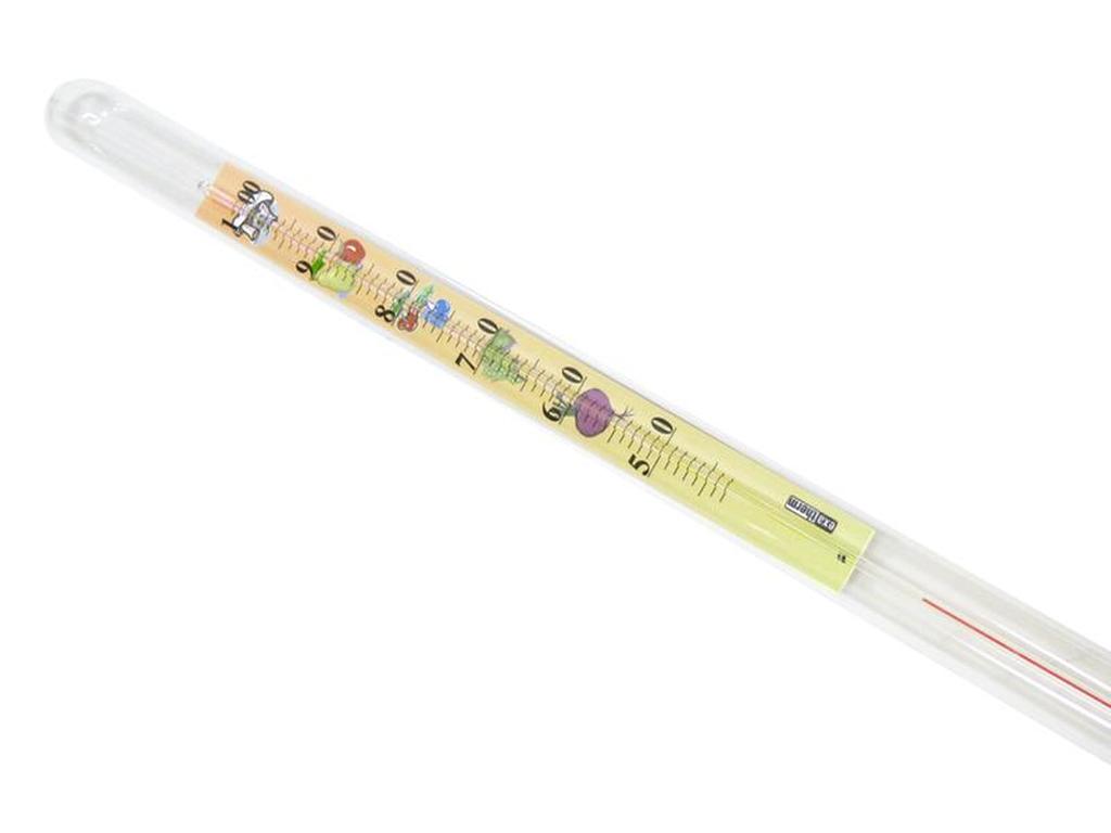 Zavařovací teploměr je hlavní součástí zavařovacích pomůcek, díky němu poznáte na kolik stupňů potraviny zavařujete, díky popisku, který je na něm uveden budete vědět na kolik stupňů se mají jednotlivé potraviny připravovat. Je snadno omyvatelný. Průměr teploměru je 1,8 cm, délka 43 cm.
