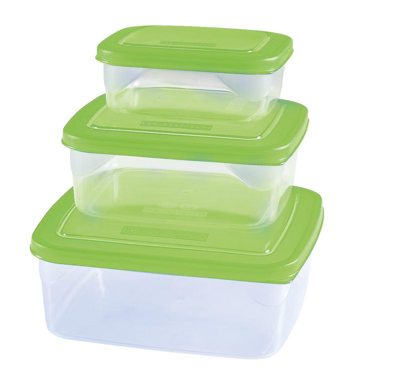 Sada 3 ks čtvercových plastových dóz, malá dóza: rozměr 13,5x13,5 cm, objem 0,6 l, střední dóza: rozměr 16,5x16,5 cm, objem 1 l, velká dóza: rozměr 19,5x19,5 cm , objem 1,8 l. Barva: zelená a modrá.